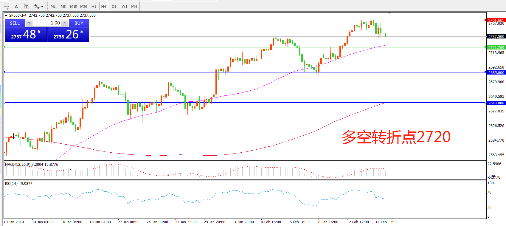 4小时图看,SP500触及2760附近阻力回落,短期调整迹象明显,MACD红柱缩短,逢RSI指标掉头向下,重点关注下方2720一线支撑。