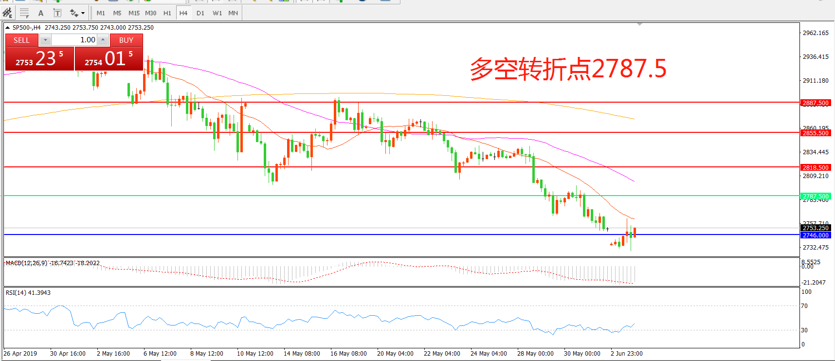 4小时图看,标普延续低位震荡走势,小幅反弹后受阻于21周期均线再度回落,MACD绿柱增加,RSI指标有拐头迹象,日内有反弹可能,但整体偏空概率较大。