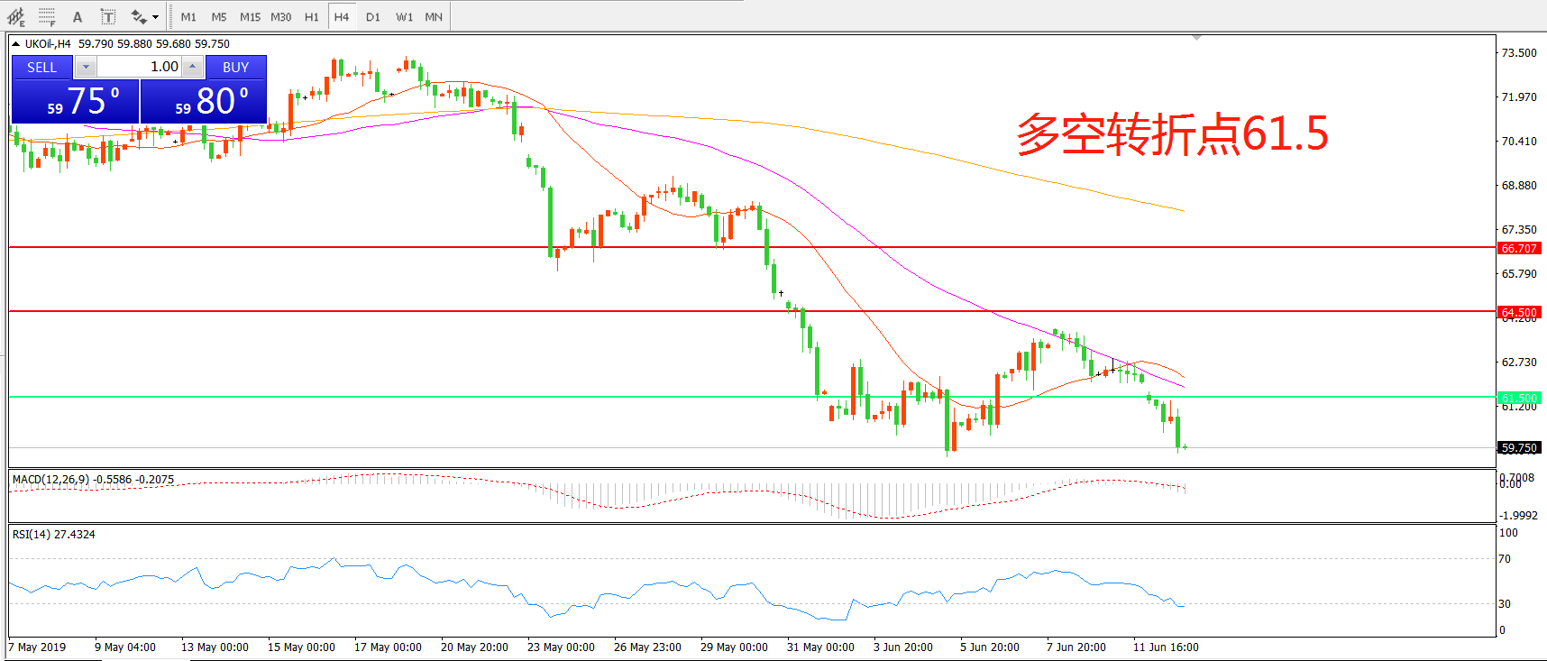 交易策略:在61.50之下看跌,目标57.50    53.00