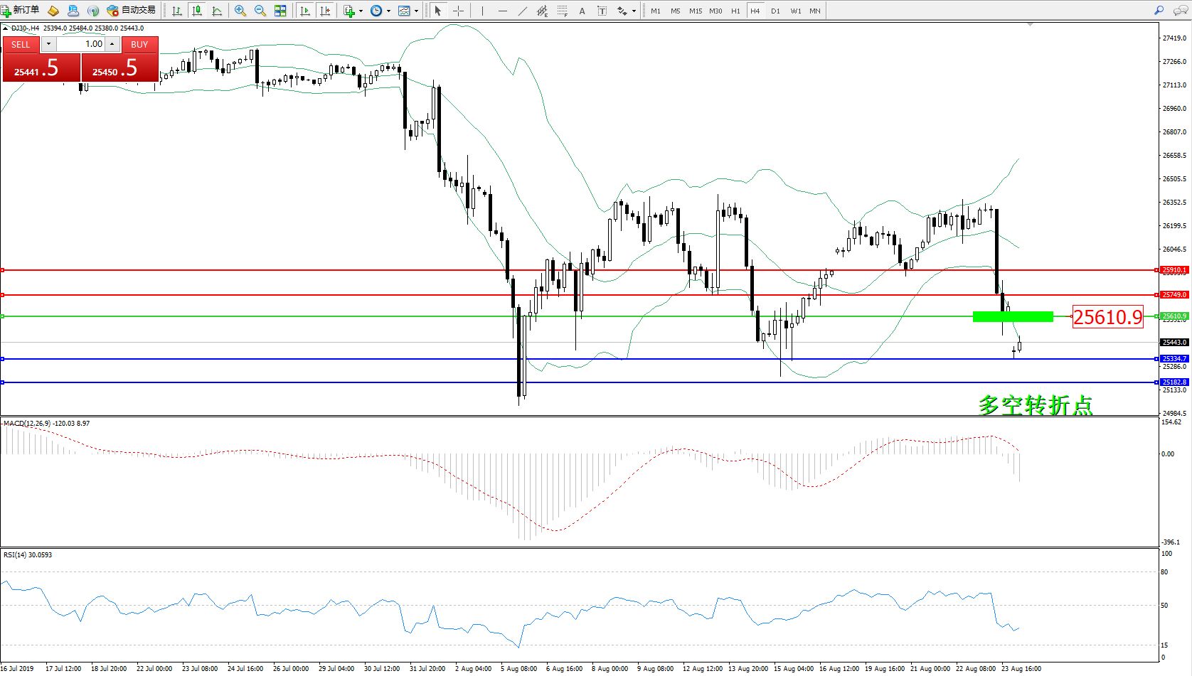 道琼斯指数DJ30—— 4小时K线图显示: