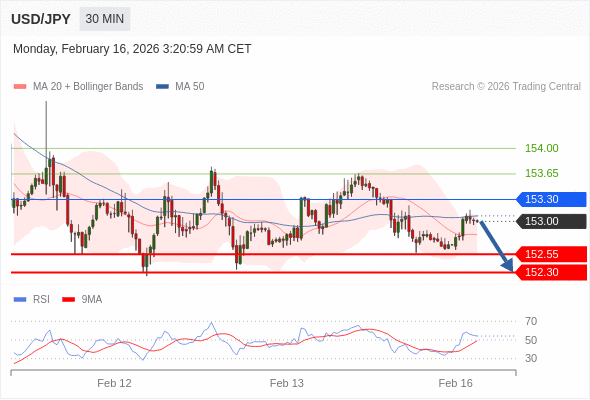 在 153.30 之下,看跌,目标价位为 152.55 ,然后为 152.30 。