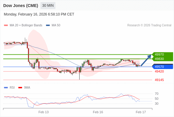 在 49570 之上,看涨,目标价位为 49830 ,然后为 49970 。