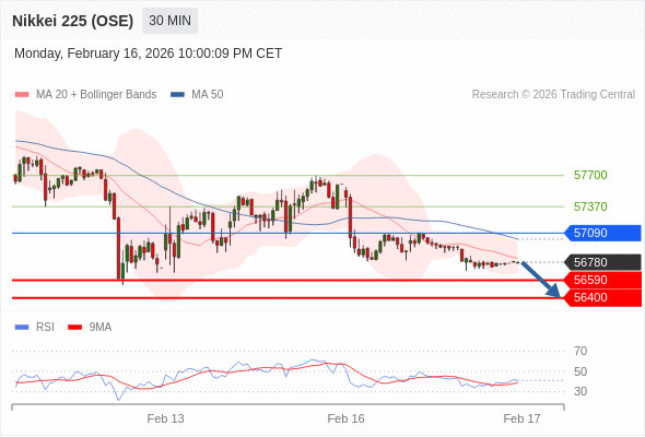 在 57090 之下,看跌,目标价位为 56590 ,然后为 56400 。