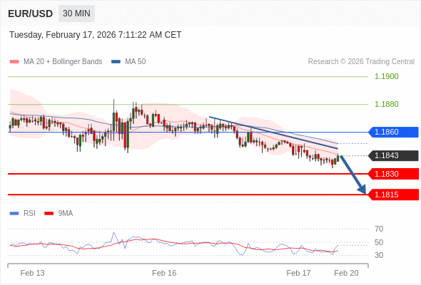 欧元/美元 当日内: 短期关键阻力位在1.1860。