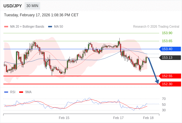 在 153.40 之下,看跌,目标价位为 152.55 ,然后为 152.30 。