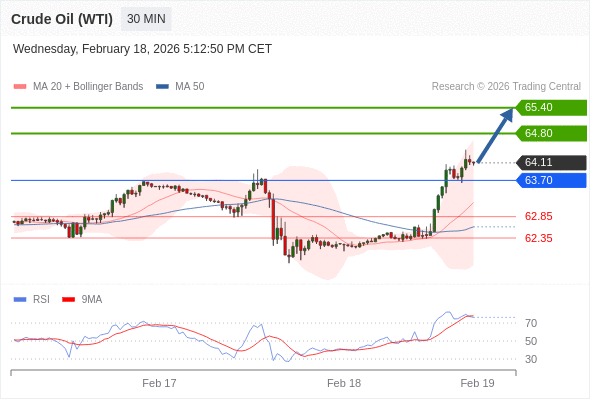 在 63.70 之上,看涨,目标价位为 64.80 ,然后为 65.40 。