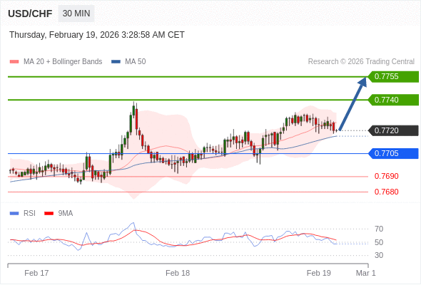 在 0.7705 之上,看涨,目标价位为 0.7740 ,然后为 0.7755 。