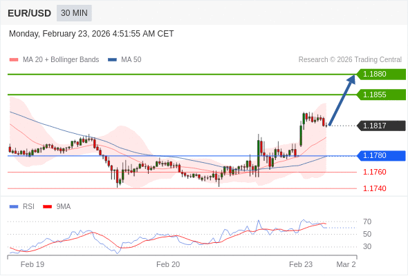在 1.1780 之上,看涨,目标价位为 1.1855 ,然后为 1.1880 。