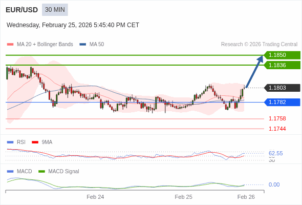 欧元/美元 当日内 : 看涨,当 1.1782 为支撑位。