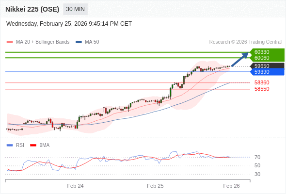 在 59390 之上,看涨,目标价位为 60060 ,然后为 60330 。