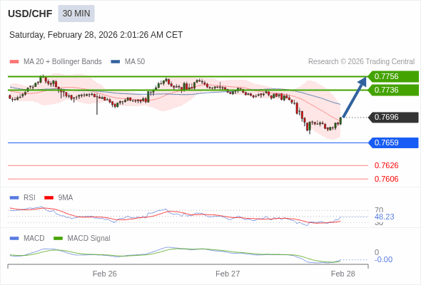美元/瑞郎 当日内 : 有上涨的可能,目标价位定在 0.7756 。