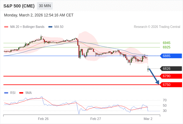 美国标普500指数期货 (H6) 当日内: 存在压力。