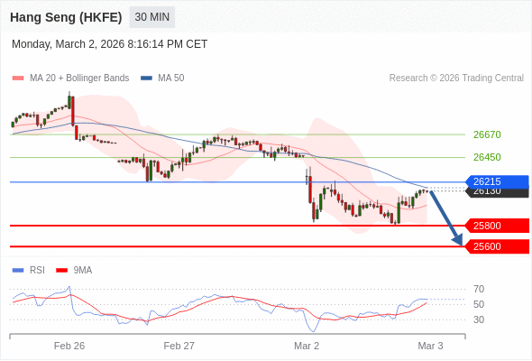 香港恒生指数期货 当日内: 短期关键阻力位在26215。
