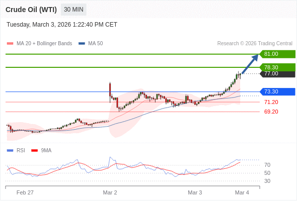 在 73.30 之上,看涨,目标价位为 78.30 ,然后为 81.00 。