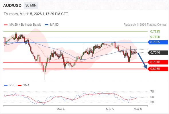 交易策略: 在 0.7085 之下,看跌,目标价位为 0.7010 ,然后为 0.6985 。