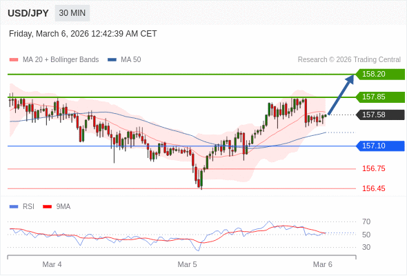 在 157.10 之上,看涨,目标价位为 157.85 ,然后为 158.20 。