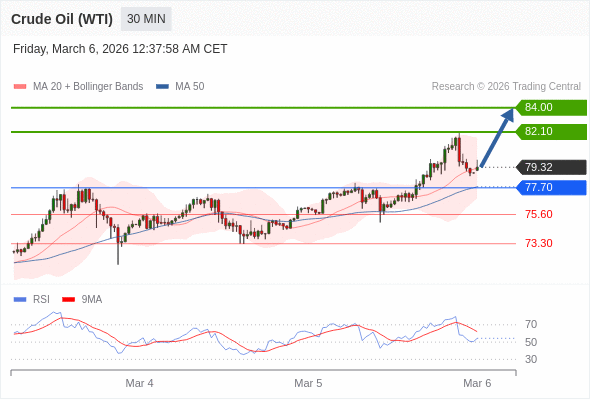 在 77.70 之上,看涨,目标价位为 82.10 ,然后为 84.00 。
