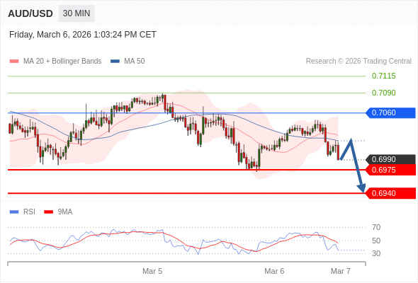 交易策略: 在 0.7060 之下,看跌,目标价位为 0.6975 ,然后为 0.6940 。
