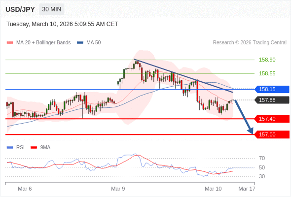 在 158.15 之下,看跌,目标价位为 157.40 ,然后为 157.00 。