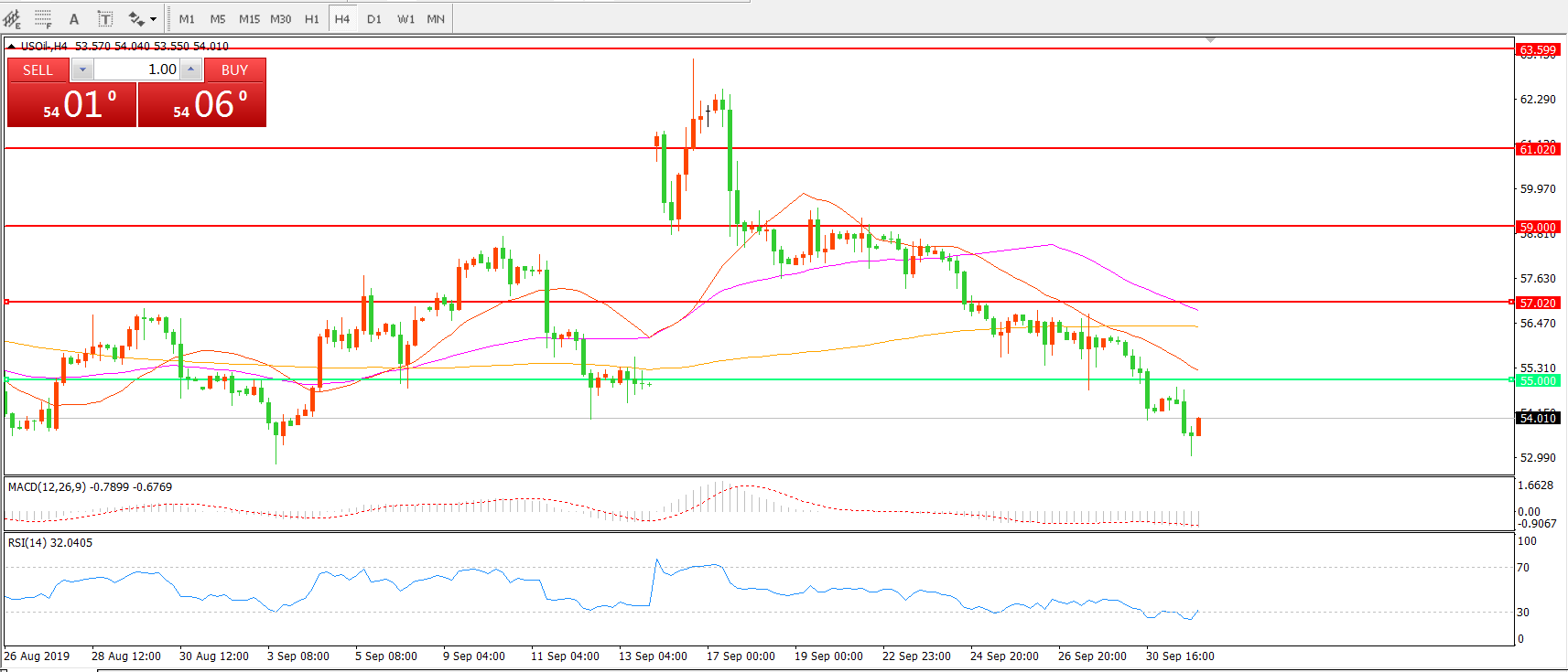 交易策略: 在55.00之下看跌,目标52.50 50.50