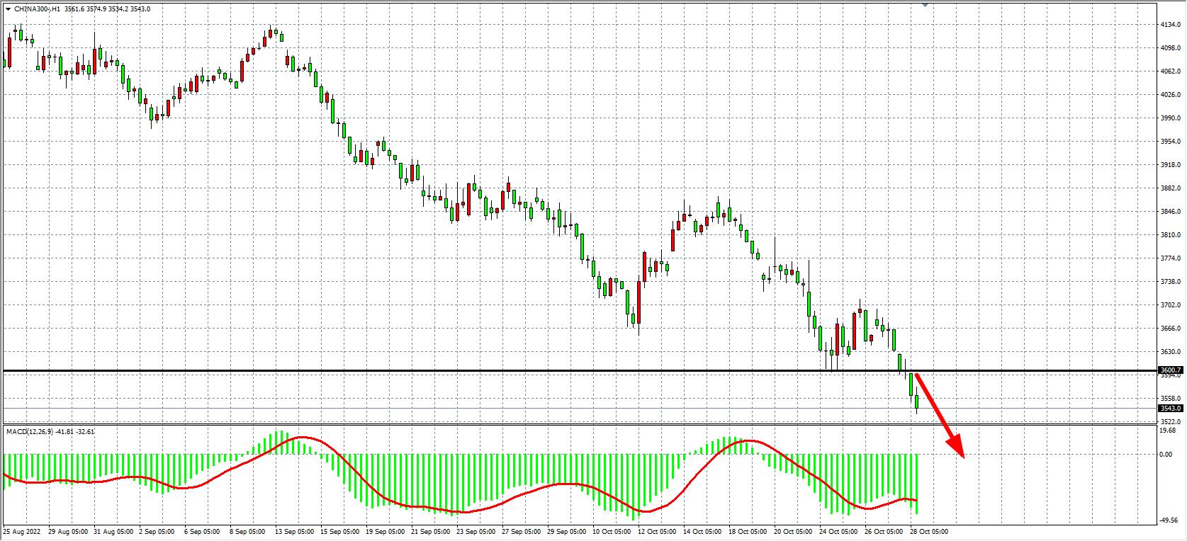 1小时图看,沪深300再度跌破3600的强支撑,目前支撑已转化为压力,同时MACD量能柱开始急剧放大,显示趋势有进一步走空的动能,日内在3600之下继续以看跌为主,下方目标看3500-3400附近