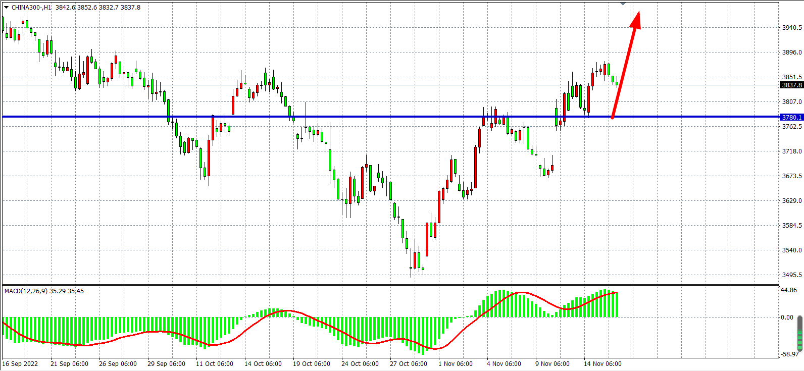 1小时图看,沪深300在3780支撑之后继续走强,MACD量能在零轴上呈放量状态,显示行情有进一步上行动力,当前支撑关注3780,日内在该位之上继续以看涨为主,目标上看3900-3980。