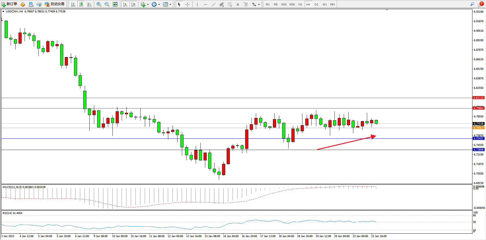 交易策略:6.76927上方看涨,目标6.79664、6.81128