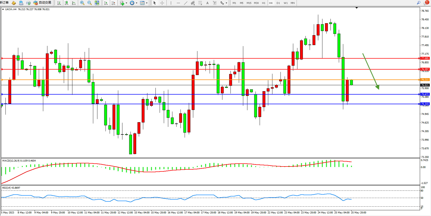 交易策略:76.211下方看跌,目标75.672 75.315