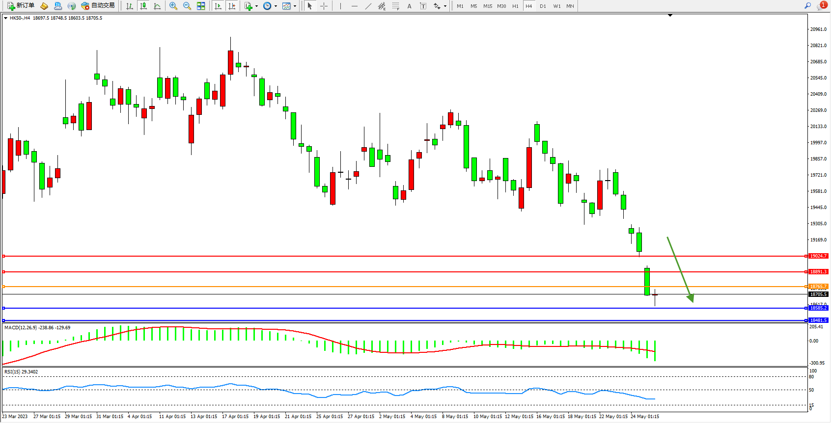 上周五香港股市休市,香港恒生指数5月25日(周四)收盘下跌369.01点,跌幅1.93%,报18746.92点;市场担忧美国债务上限谈判,惠誉把美国评级列负面观察名单,风险市场持续表现谨慎。港股三大指数全天维持大跌行情,恒指跌1.93%,国指、恒生科技指数分别下跌2.23%及2.25%,三者皆创5个月低价。权重科技股、大金融股、中字头股全线萎靡,大市承压十分明显,京东、美团、腾讯均跌超3%,南下资金全日逆势大幅净流入83.65亿港元,大市成交额为1155亿港元。