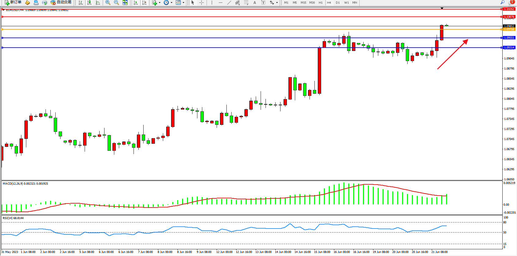 欧元美元EURUSD—4小时K线图显示: