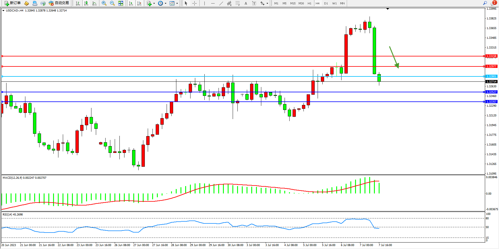 美元加元USDCAD——4小时K线图显示: