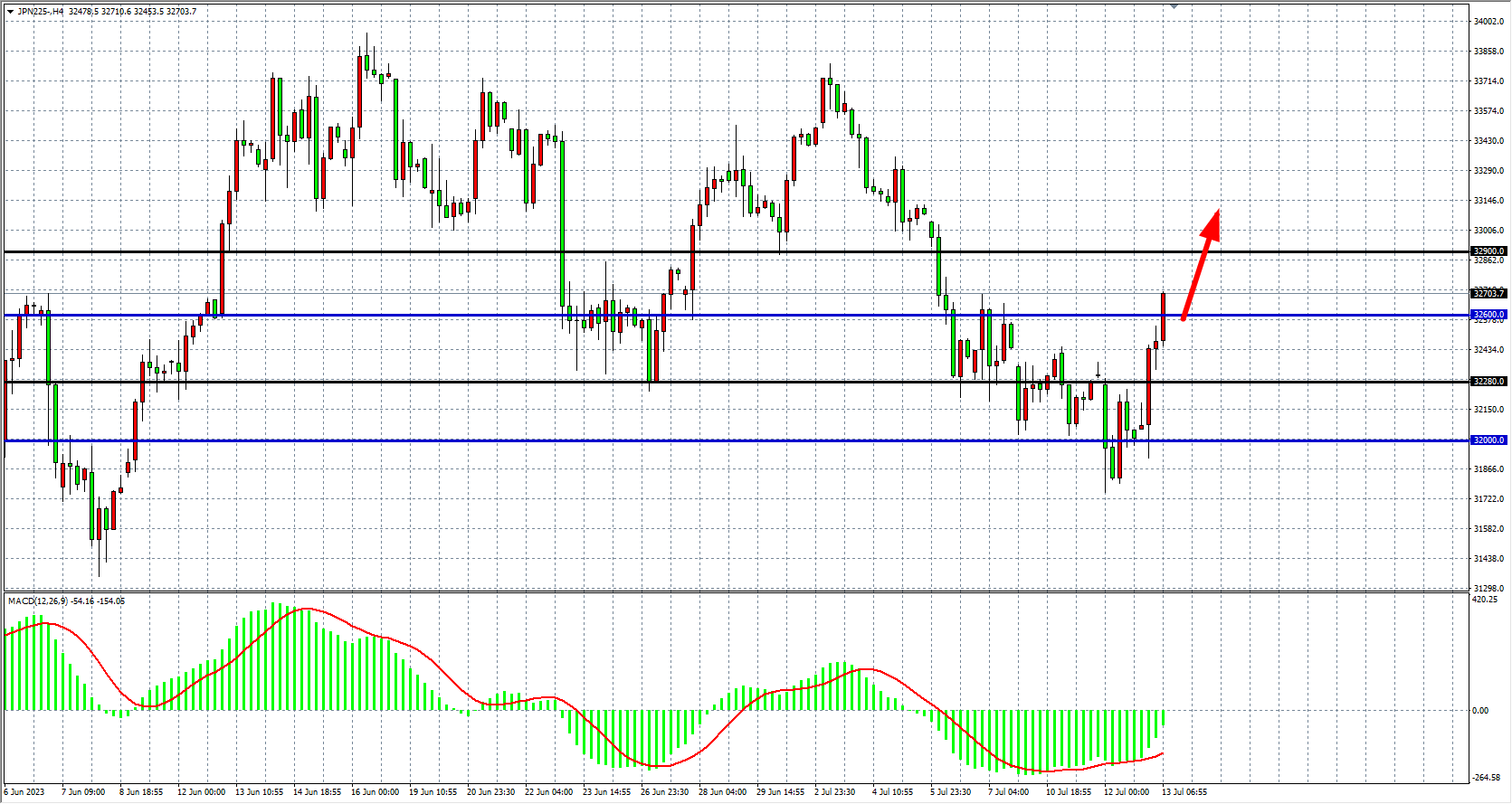 4小时图看,日经指数接连走强上破压力,MACD量能在零轴下缩量,行i去那个展开反弹,支撑关注32300-32600附近,上方阻力看32900-33300。