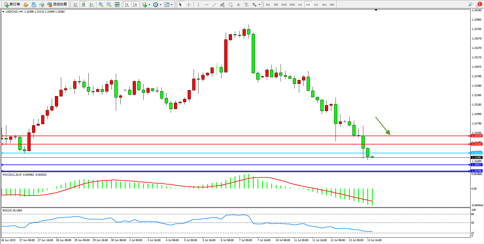 美元加元USDCAD——4小时K线图显示: