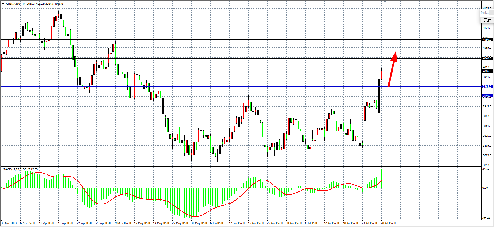 4小时图看,沪深300一举上破4000关口创出新高,MACD在零轴上持续放量,行情形成破位上攻,支撑上移3940-3965附近,上方压力看4040-4090。