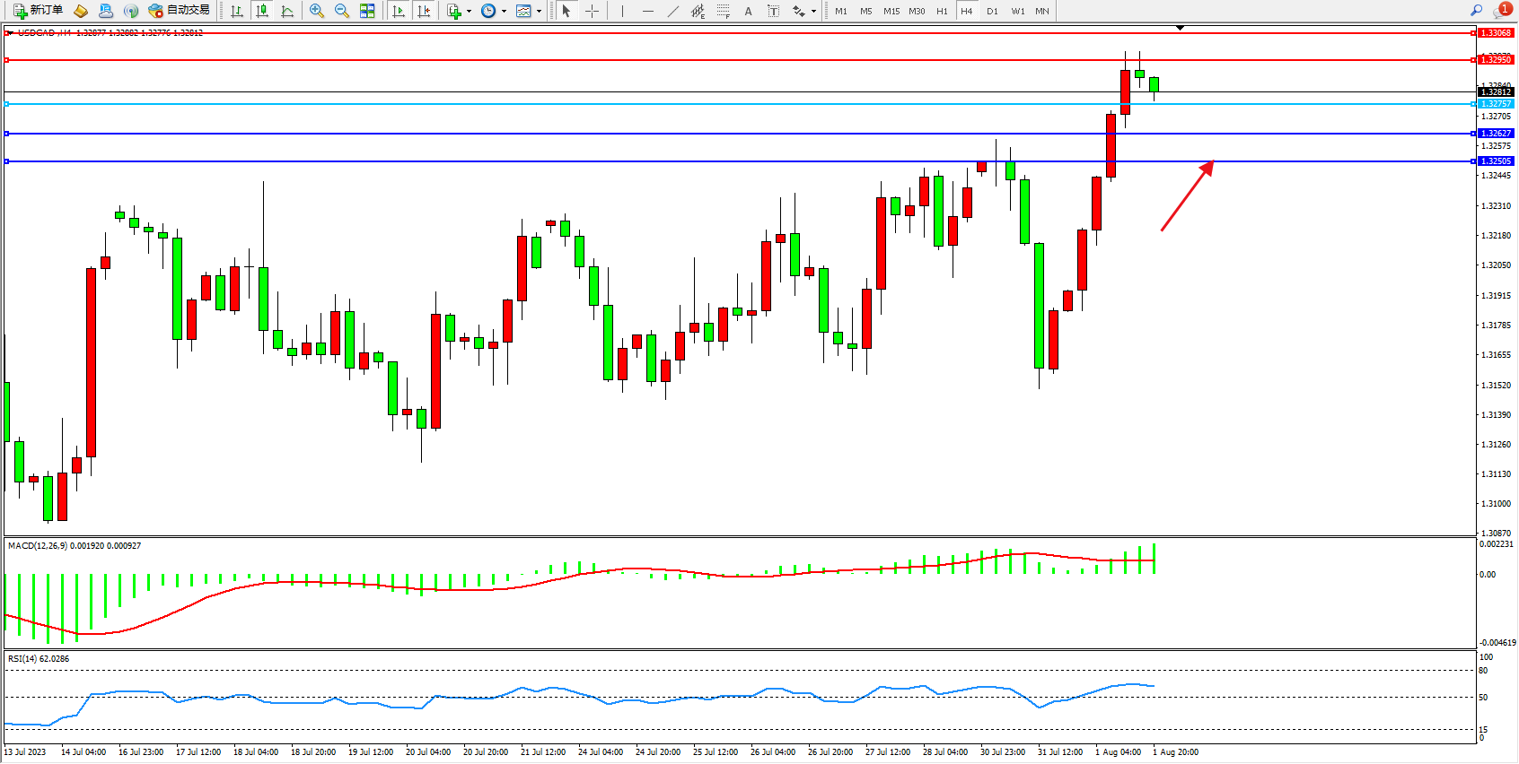 美元加元USDCAD——4小时K线图显示:
