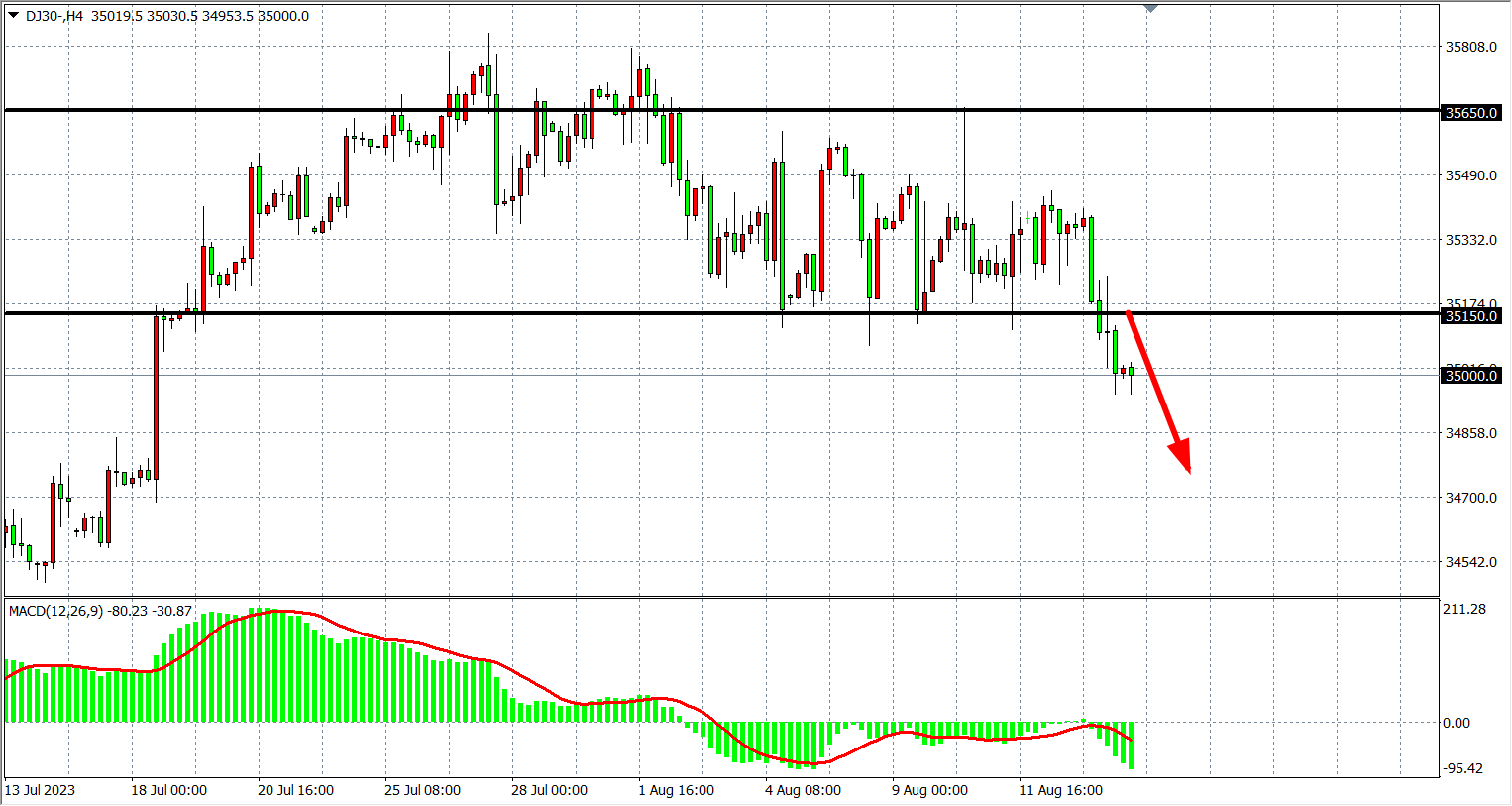 4小时图看,道指进一步跌破35150,MACD在零轴下重新放量,行情继续进入空头,阻力关注35150,支撑关注34800-34500。