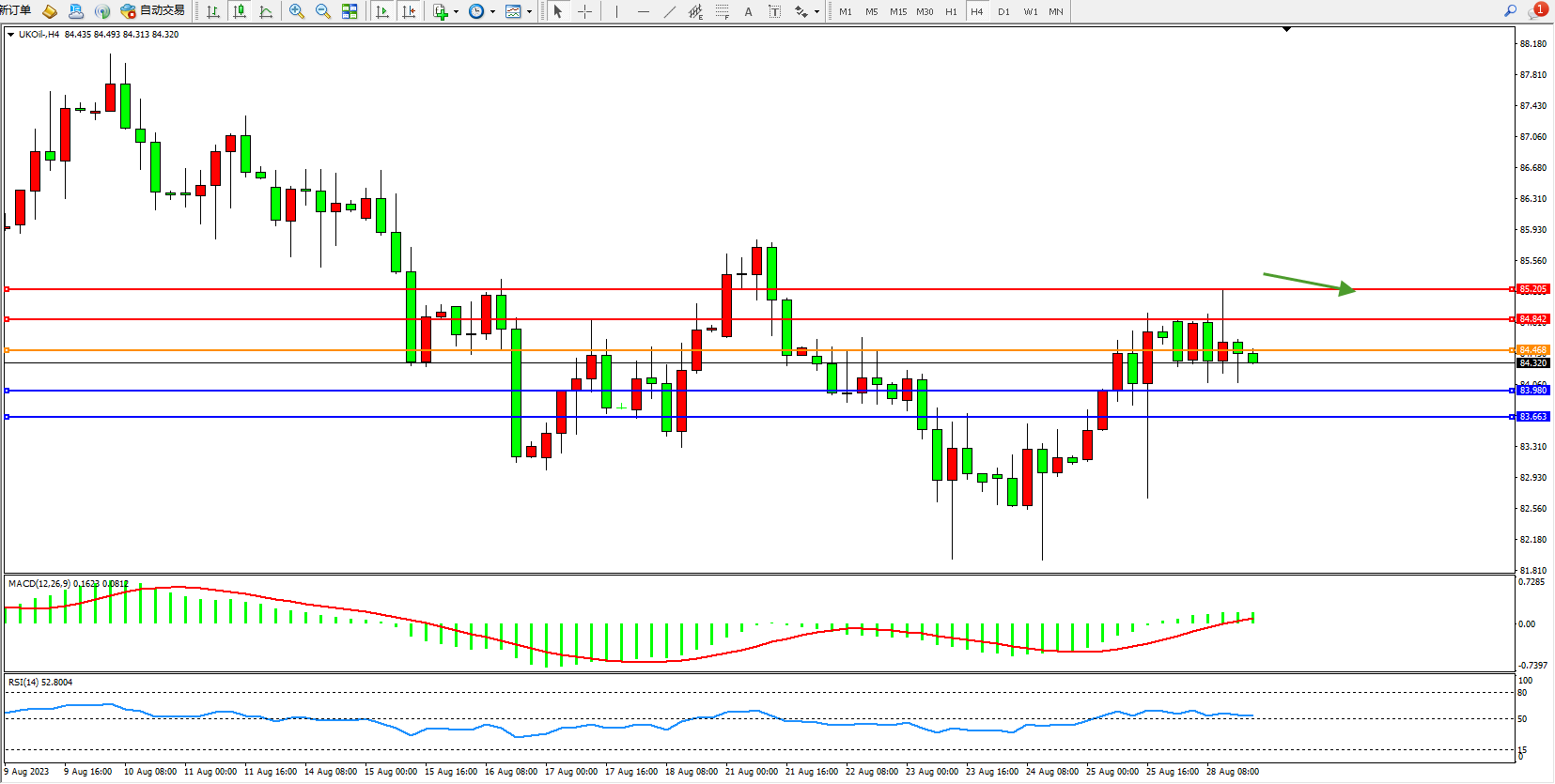 备选策略:84.468上方看涨,目标84.842  85.205