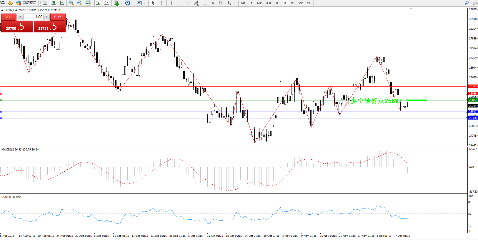 恒指HK50 ——4小时K线图显示: