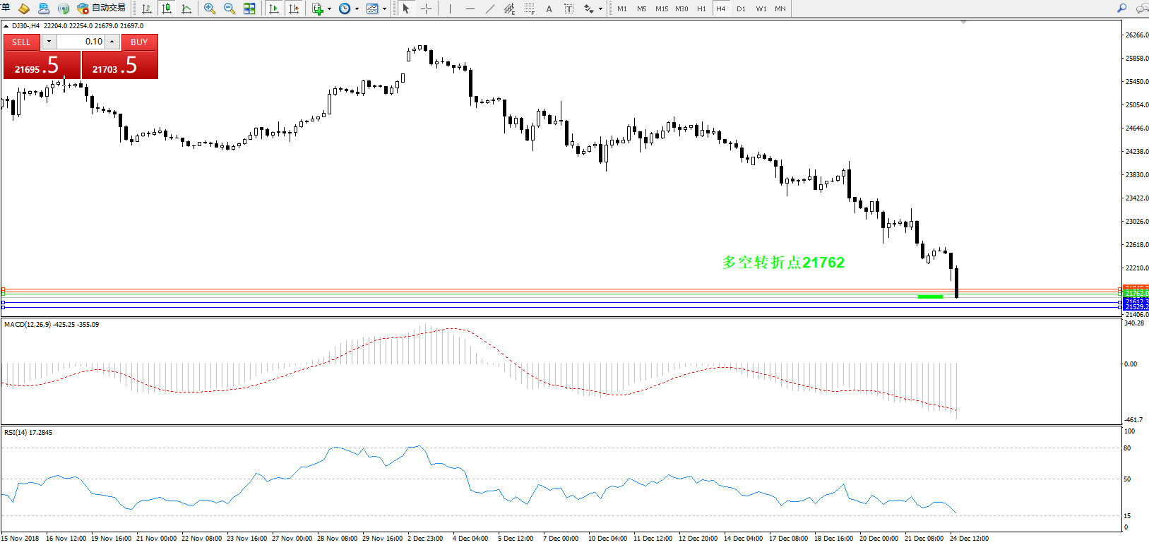道琼斯指数DJ30—— 4小时K线图显示: