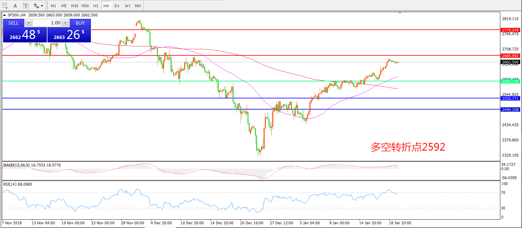 4小时图看,SP500近期逐渐站稳200周期均线,短期55均线有拐头上升迹象,MACD红柱缩短,小幅反弹成为可能。