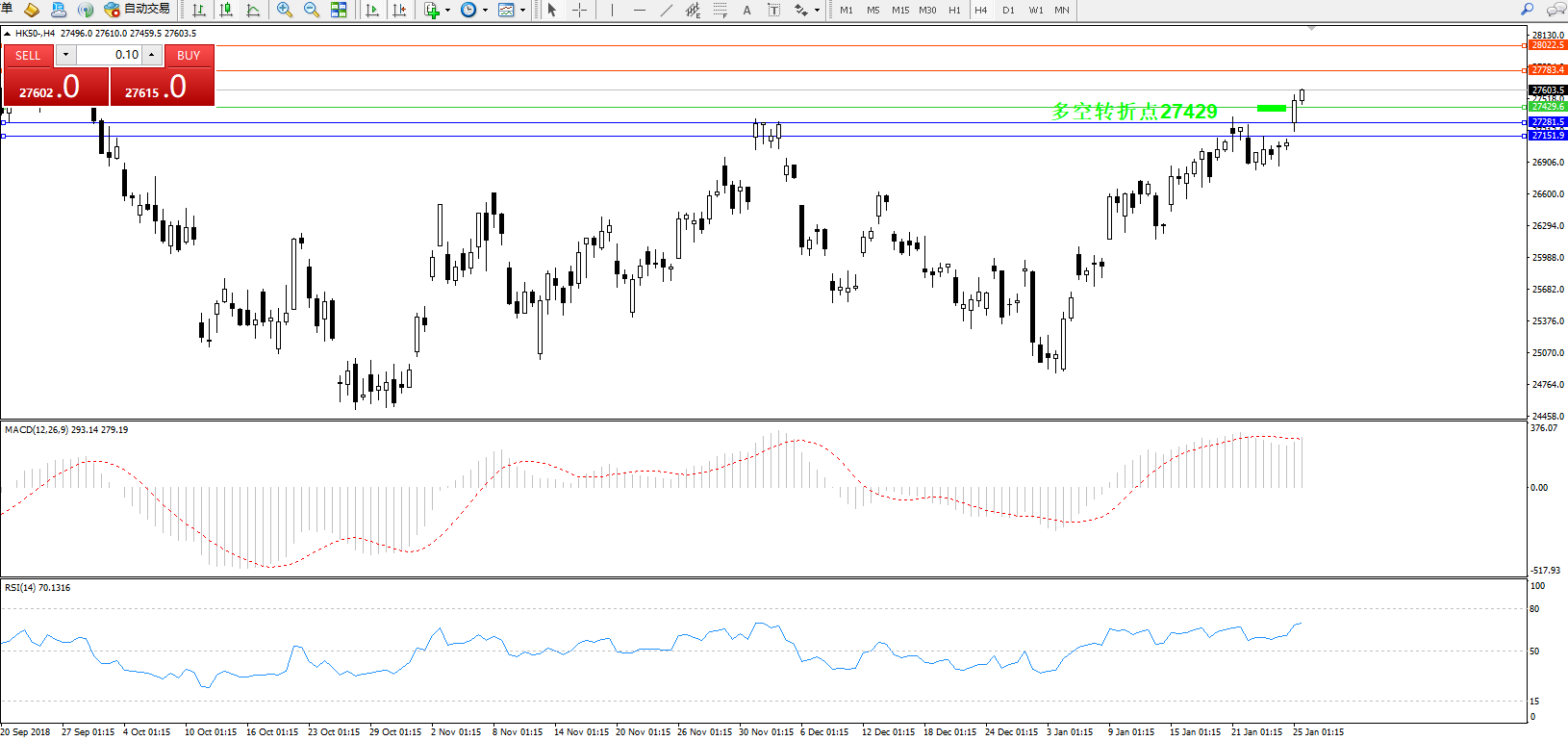 恒指HK50 ——4小时K线图显示: