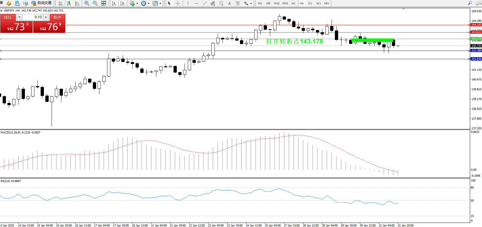交易策略:143.178下方看跌,目标142.389、141.836