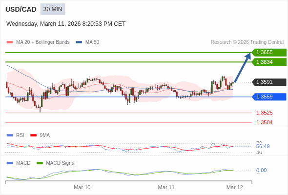 美元/加元 当日内 : 看涨,当 1.3559 为支撑位。