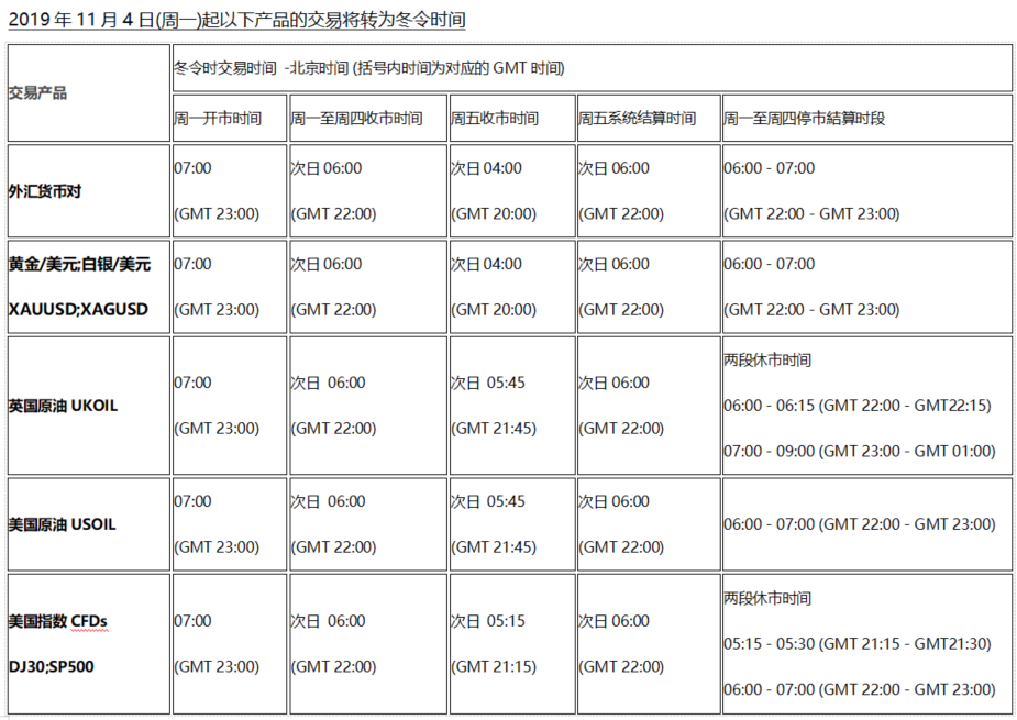 欧洲时区2019年10月28日(周)及北美时区2019年11月4(周)开始分别转为冬令时交易时间, 各欧美市场产品交易时间将随调整为冬令时交易时间,敬请留意!