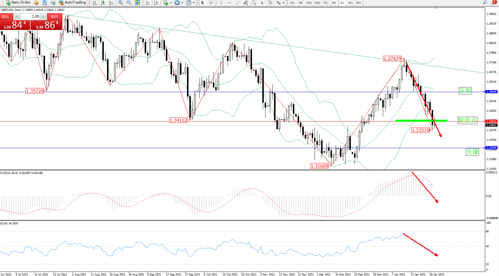 空头动力高位急速震荡下挫,低位抵达1.33570附近节点整理,短期空头动力有继续下行态势,布林带指标呈缓慢张口走势中,上方压制关注1.35649附近,低位支撑关注1.32594附近,关注1.34033附近转折点,MACD指标空头动力维持震荡下行至0轴线下侧徘徊,RSI指标处于50均衡线下方弱势整理下行中,如图: