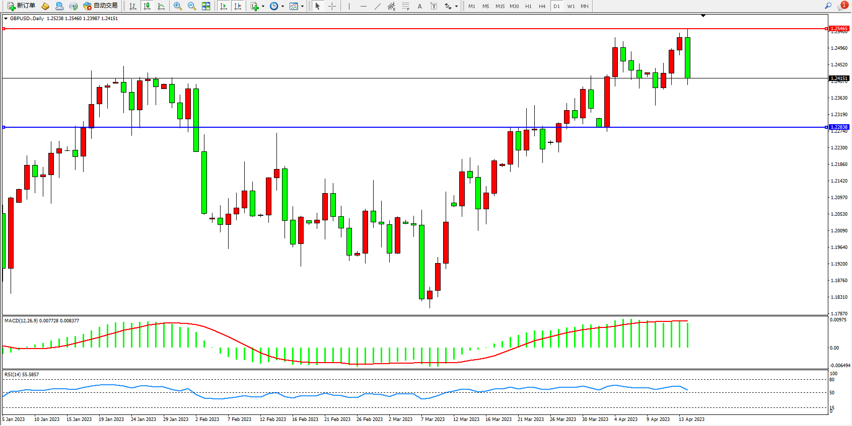 多头动力持续宽幅震荡上扬后,高位遇阻回撤,空头动力伺机入场,短期或将继续回撤,上方压制关注1.25465附近,低位支撑关注1.22838附近,MACD指标处于多头区域高位徘徊,RSI指标处于50均衡线上侧弱势震荡,如图: